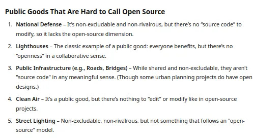 那么,「开源」和「公共物品」到底有什么区别?我们可以通过一些例子来对比: